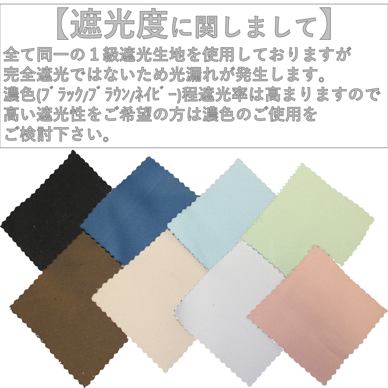 | 色 | 遮光1級無地:アイボリー、ブラウン、グリーン、ネイビー 遮光1級:白木 アイボリー 遮光1級:雲 ブルー 遮光1級:星 ネイビー 防炎遮光1級:無地 ホワイト、グリーン、イエロー、ピンク 防炎遮光1級:リーフ ベージュ ミラーレースストライプ:アイボリー |