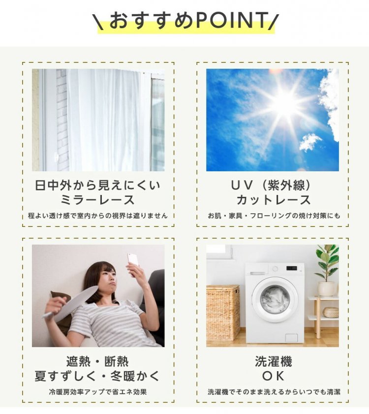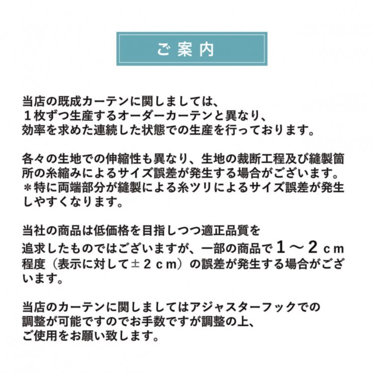 | 商品仕様 | UVカット率56.7% 断熱効果率18.7% 保温効果率12.2% ・メール便でお届けするためにフックは別梱包になります。(お客様ご自身でお取り付けをお願い致します)。 ・幅130,150,200cmは生地幅の関係で幅巾継ぎが発生します。 ・配送はヤマト運輸メール便(ネコポス)のため、ポスト投函となります。(配送日時指定はできません) ・東北~中四国までは翌日のお届け、北海道・九州・沖縄は翌々日のお届け予定となります。 ・2セットまではネコポス、3セット以上同時ご購入の場合、ヤマト運輸(宅配便)での発送になります。 |