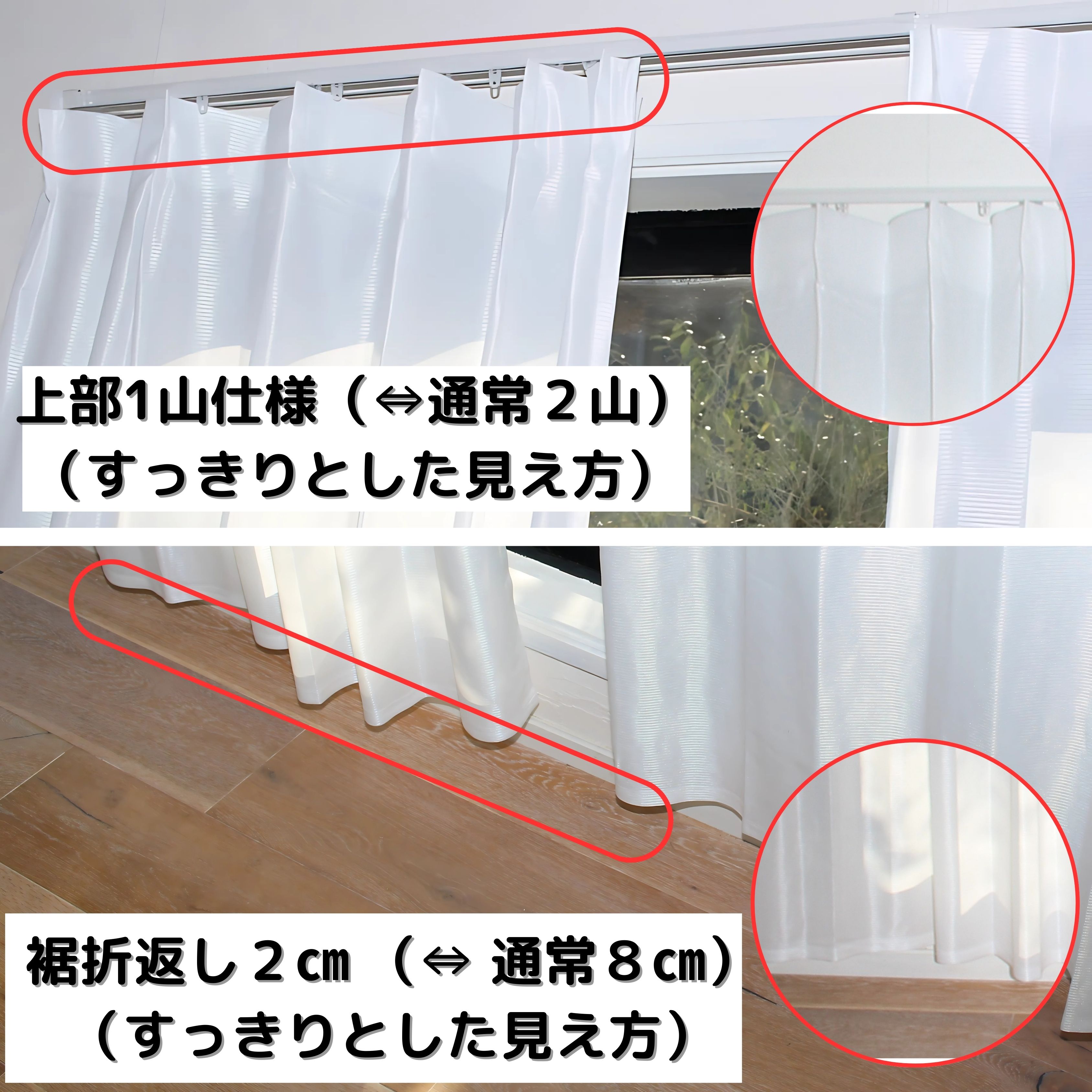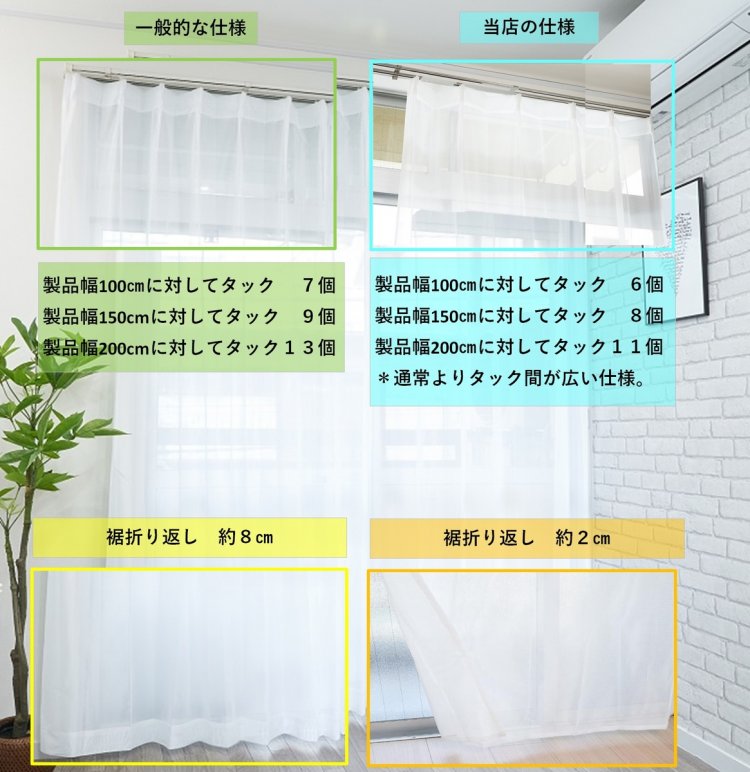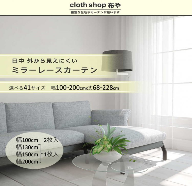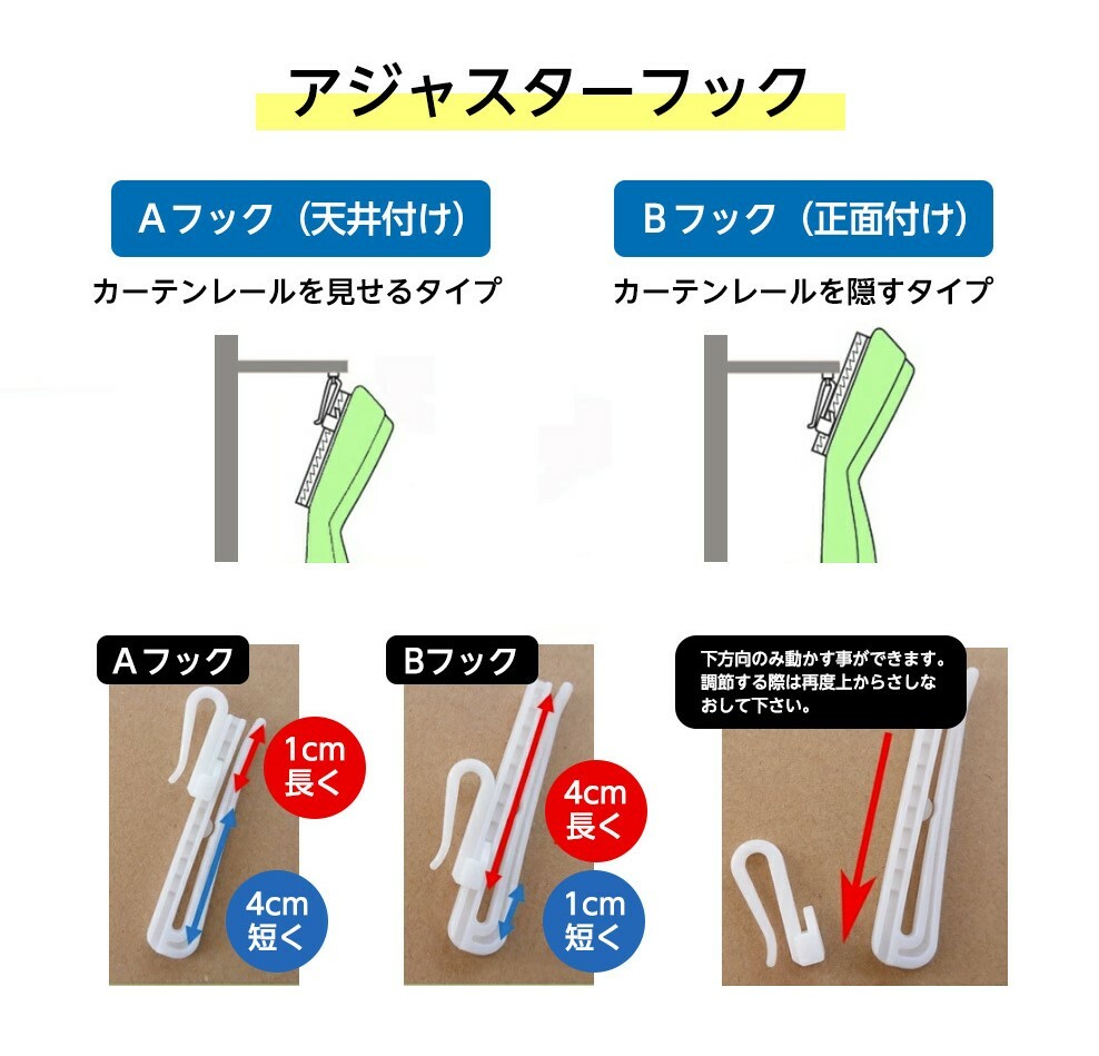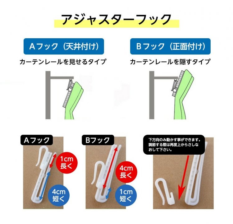 | 注意書き | モニターの発色画面によって色合いが異なって見えることがございます。 生地はやや薄めのミラータイプです。 ミラー効果は日中(太陽光が強い状況)に発揮されます。 夜間など外が暗く室内が明るい状況では効果は弱まります。 こちらの商品に付属のアジャスターフックはAフックの状態での納品となります。 アジャスターフックですので調整可能ですが、 表示している丈はAフックで使用した場合のサイズになります。 Bフックの形状にしますとそれぞれの製品丈が3CM程度短くなります。 写真はイメージです。 フックは製品1枚に対して下記の本数になります。 幅100cm フック6本 幅130cm フック7本 幅150cm フック8本 幅200cm フック11本 裾の折り返しは約2cmです。 生地幅の関係上、幅130,150,200cmは生地の継ぎ目が発生いたします。 |