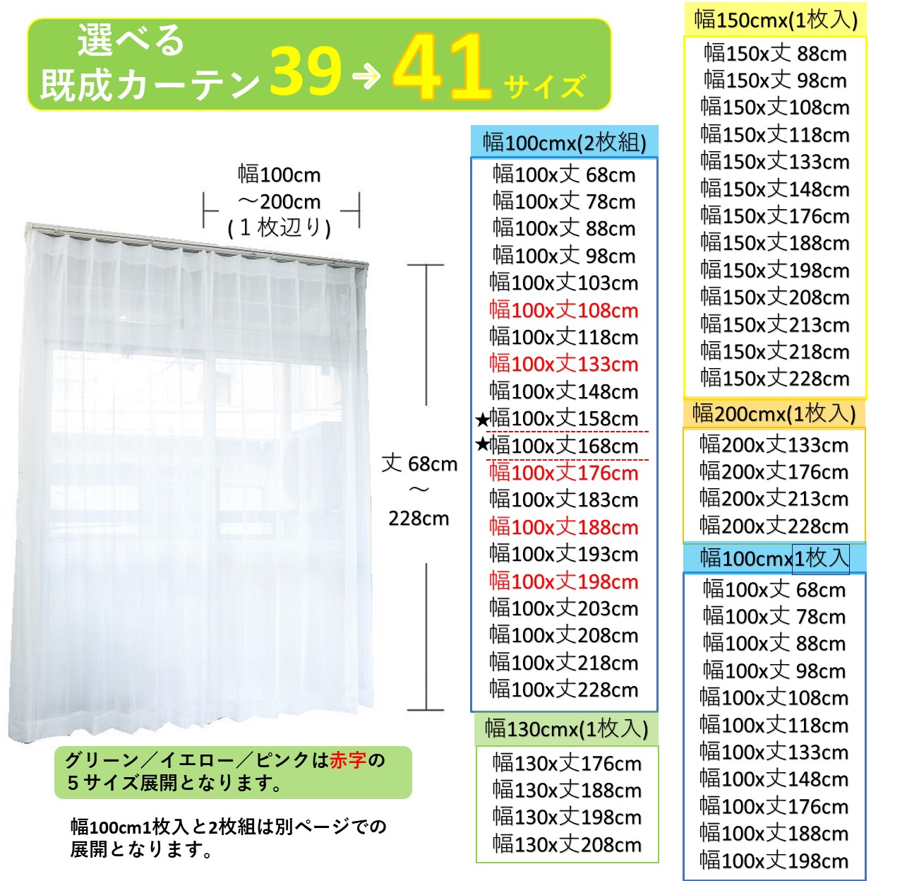 | サイズ | 下記45サイズ展開 ◆幅100cm2枚組 丈 68/78/88/98/103/108/118/133 丈148/176/183/188/193/198 丈203/208/218/228 ◆幅1301枚入 丈176/188/198/208 ◆幅150cm1枚入 丈 88/98/108/118/133/148/176/188 丈198/208/213/218/228 ◆幅2001枚入 丈133/176/213/228 |