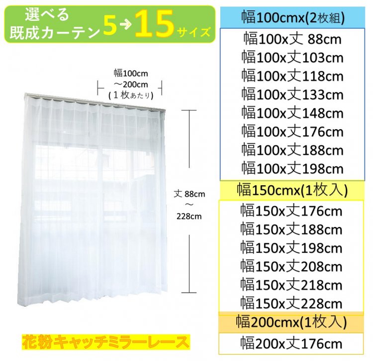 | サイズ | ◆巾100cm2枚組 丈103/133/176 188/198cm ◆巾150cm1枚入 丈176cm ◆巾200cm1枚入り 丈176cm |