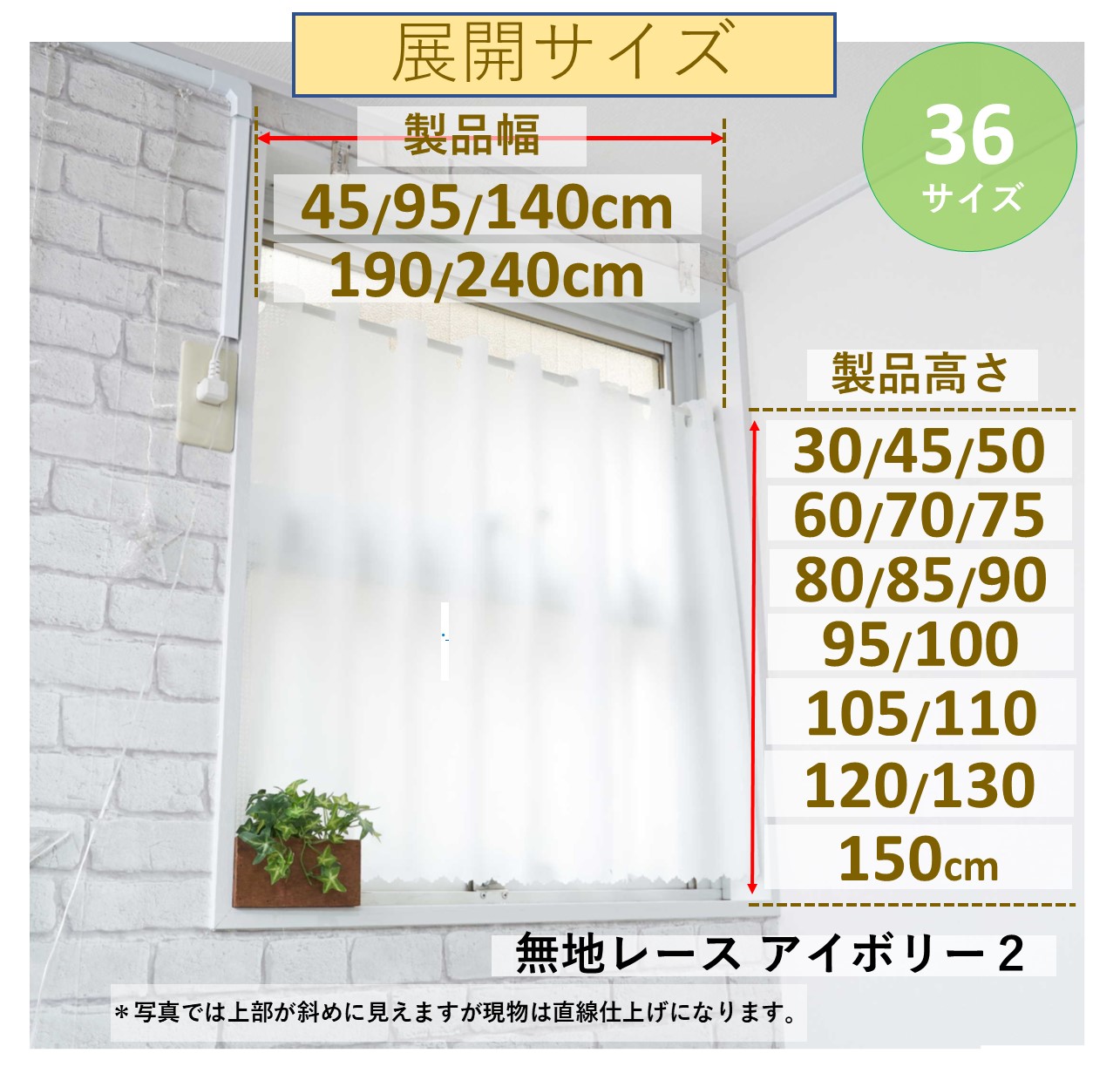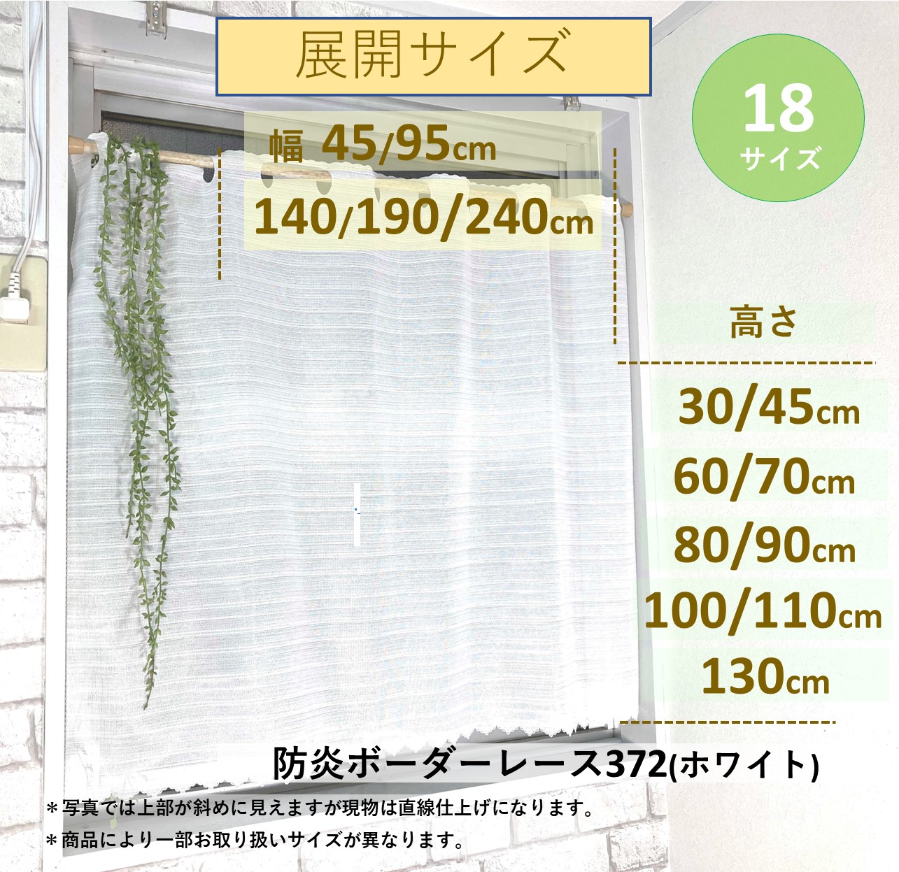 | 色 | ストライプ(アイボリー) 無 地 (ホワイト) 裾トリム (アイボリー) 無地 (アイボリー) 防炎ボーダー(ホワイト,グリーン,イエロー,ピンク) SU(ストライプ,ハート,ハナ) 花粉キャッチ無地(ホワイト)の7タイプより選べます。 |