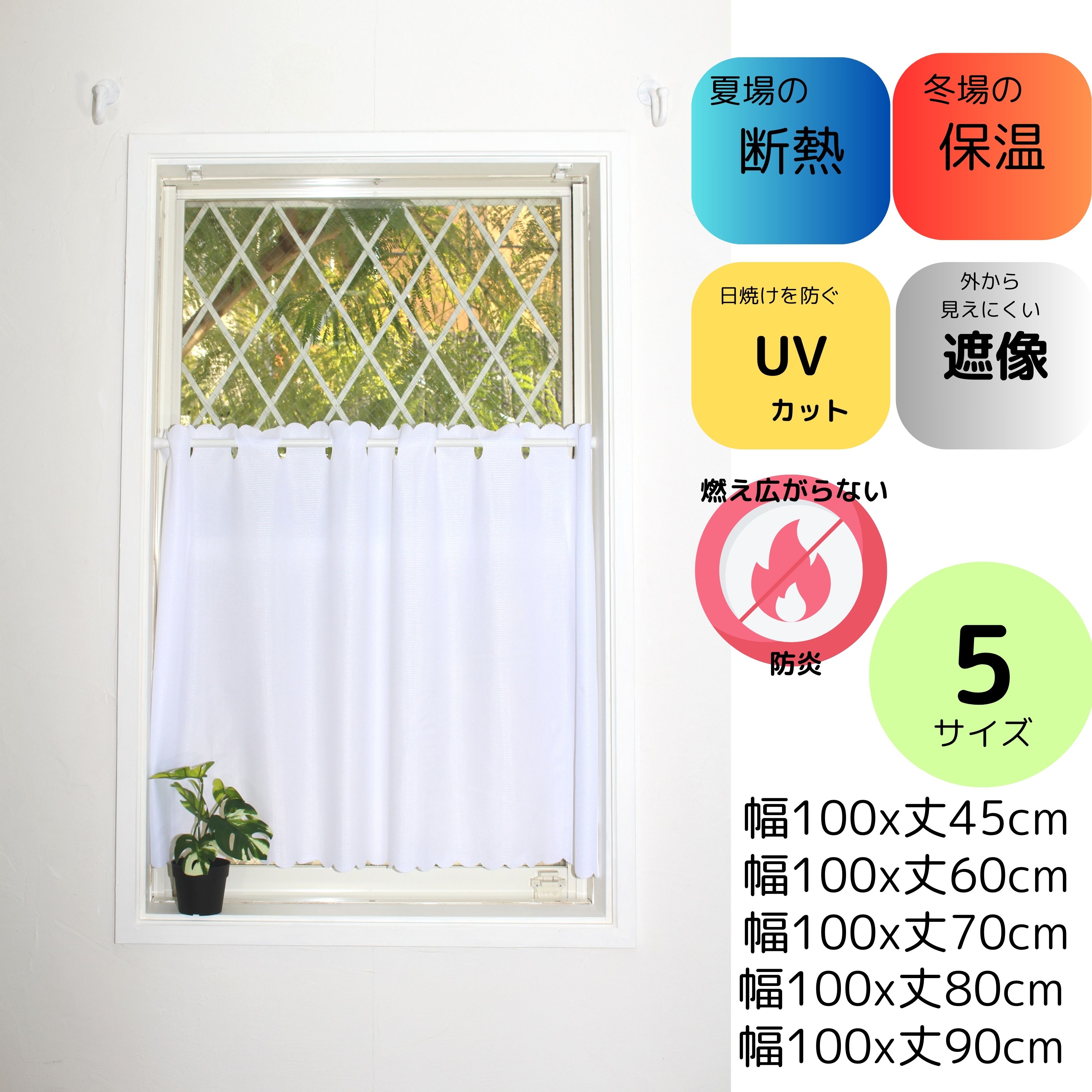 | 商品仕様 | ◆小窓やカラーボックス等の目隠しにピッタリ! ◆紫外線カット率: ストライプ 84%/ 無地(アイボリー)86%/防炎ボーダー80% レオーネ ストライプ 70% ◆夏場の断熱性 無地(ホワイト) 22.2%5.4℃/ ストライプ26.7%6.4℃/ 無地(アイボリー)26%6.0℃/ 花粉キャッチ無地 UVカット率61% 日中外から見えにくいミラータイプ 花粉キャッチ効果 158%(未加工布比較) 5回洗濯後も効果は残ります。 ◆紫外線カット・断熱効果があり、西日の強い窓や 夏の車の窓などでの使用に適しています。 ◆プライバシー保護にピッタリの透けにくさもあります。 ◆製品幅 100cm x製品丈45,70,90cm ◆適応窓幅60~80cm ◆竿通し部分: 無地ホワイト、ストライプ 直径幅約4.5cm 無地アイボリー、防炎ボーダー、SUシリーズ ヨコ2.0CMXタテ3.0cm 突っ張り棒の直径1.2cmまでのものがスムーズにご使用可能です。市販の物をご用意ください。 ◆ポリエステル100%。 ◆中国製。 ◆送料無料:ヤマト運輸 ネコポス【ポスト投函】(メール便) 日時指定できません。 |