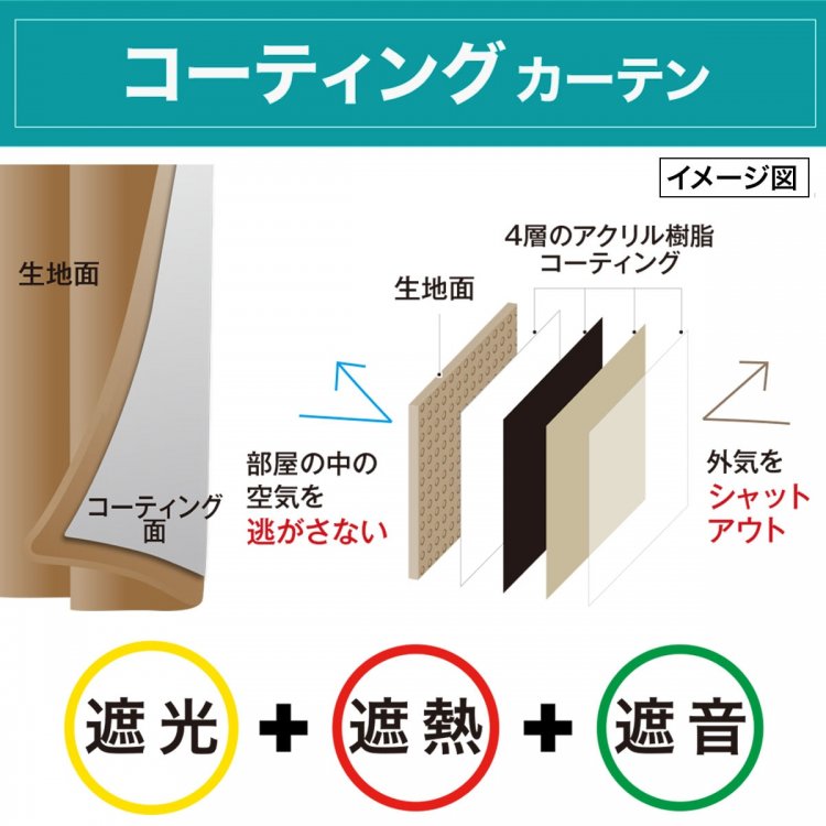遮音効果:生地の裏面に樹脂コーディングをすることで室内の音を漏れにくく、外からの音を軽減します。